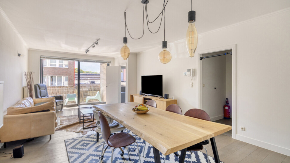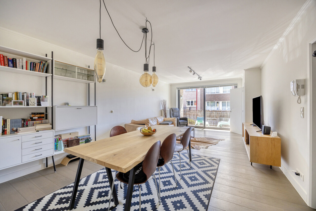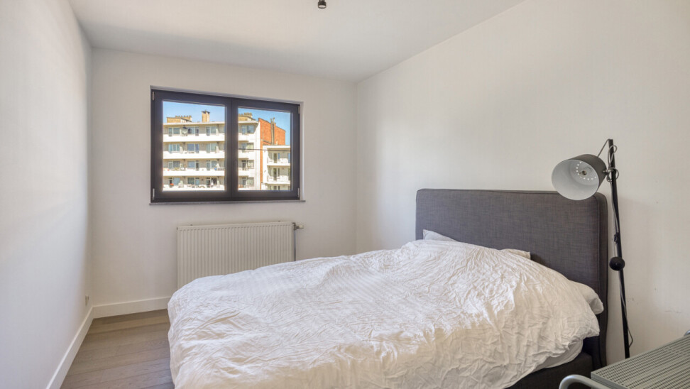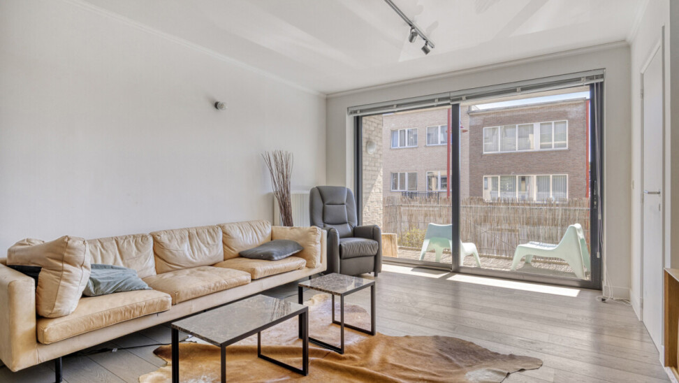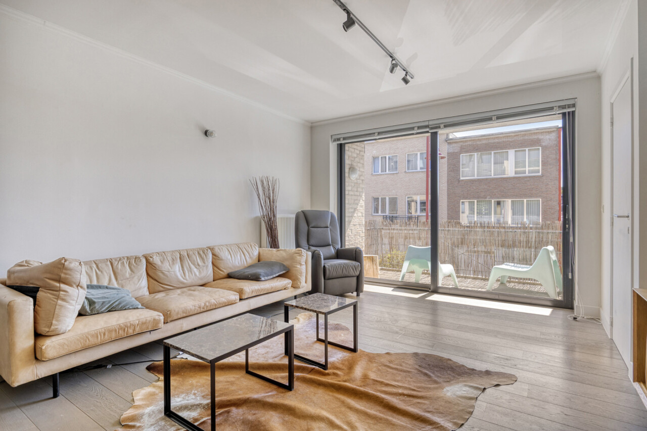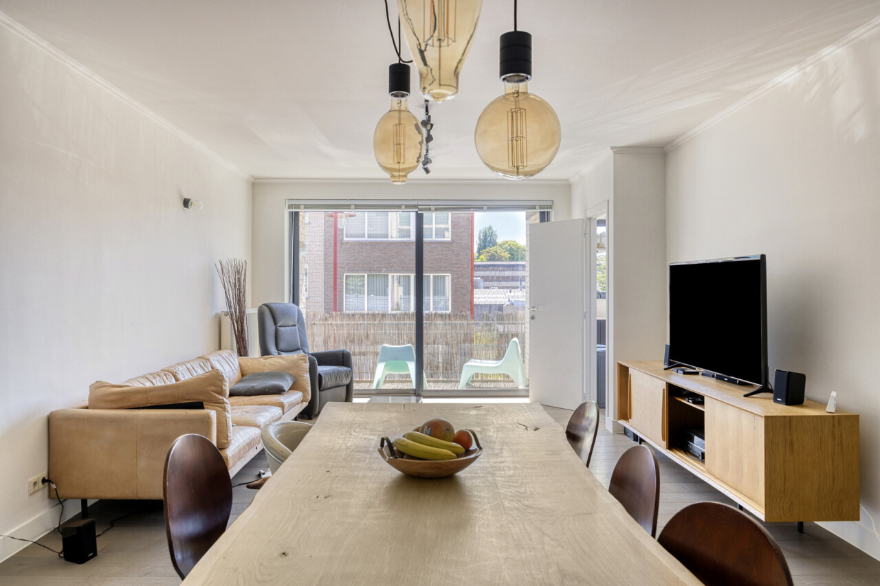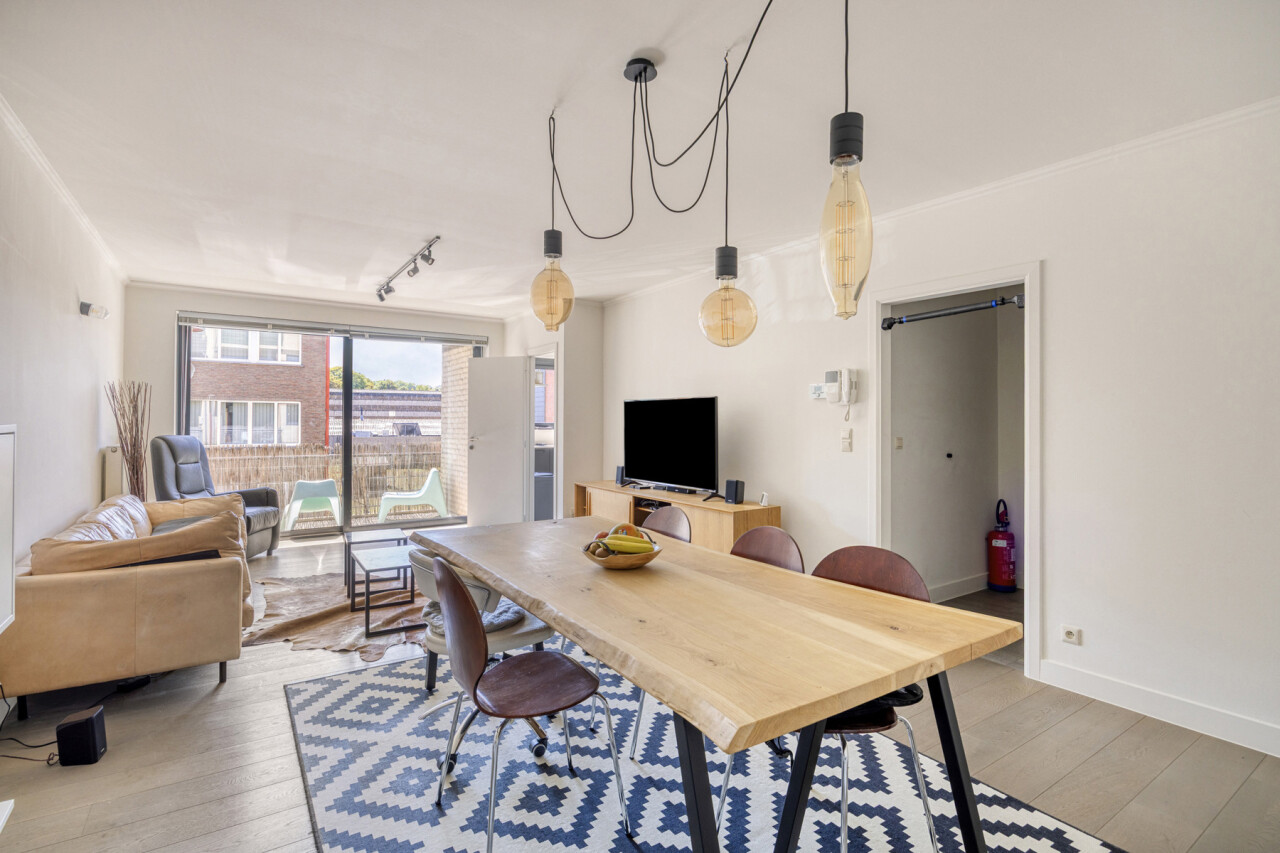 In residentie Amber (bj 2002) vindt u dit instapklaar appartement gelegen op de eerste verdieping met aangenaam terras. Het betreft een goed onderhouden residentie met lift. Het lichtrijk appartement werd grondig gerenoveerd en voorzien van nieuwe vloerbekleding, ingerichte keuken, toilet en badkamer. Indeling appartement: inkom met vestiaire, rechthoekige leefkamer met toegang tot keuken en naastgelegen berging, nachthal met toegang tot toilet, 2 ruime slaapkamers (16 – 13m²) en badkamer (dubbele wastafel, douche in bad). Aangenaam zuidgericht terras aan de voorkant van het appartement, aansluitend aan de leefkamer. Het appartement beschikt over een veiligheidsdeur, individuele tellers voor nutsvoorzieningen, rolluiken in de slaapkamers, een conforme elektrische keuring en een gunstige EPC-score. Bovendien heeft u tevens het genot van de gemeenschappelijke tuin. Gelegen in een rustige, vlot bereikbare straat met een goede verbinding naar openbaar vervoer, scholen en andere faciliteiten. Geschikt voor eigen bewoning of investering met mooi rendement. Stedenbouwkundige inlichtingen in aanvraag.