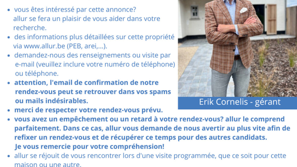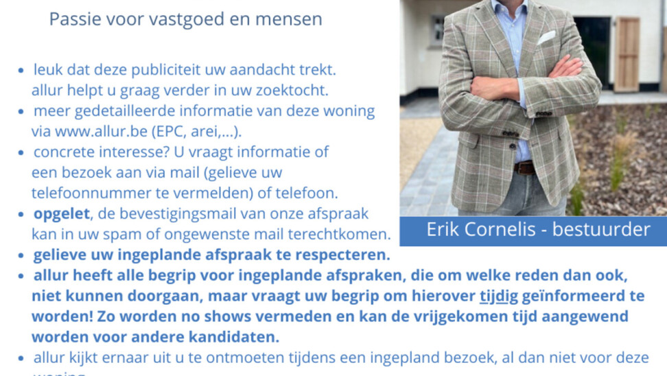 Om een afspraak in te plannen, gelieve uw aanvraag in te dienen via info@allur.be. Rustig gelegen in een kindvriendelijke wijk, in een doodlopende straat, met uitstekende verbinding naar openbaar vervoer, buurtwinkels, scholen, invalswegen, Brusselse ring, vindt u deze praktische rijwoning (bj 1976) met 3 slaapkamers. Het betreft een solide woning op een zeer aangename locatie, die enige opfrissing vereist. Indeling gelijkvloers: inkom met toilet, rechthoekige leefkamer, keuken met toegang tot de tuin. Het nachtgedeelte bestaat uit een nachthal die toegang geeft tot 3 slaapkamers, badkamer en berging. De berging kan geïntegreerd worden in de badkamer om deze te verruimen. Aangename onderhoudsvriendelijke zuid-georiënteerde tuin. De woning is deels onderkelderd en beschikt over een bergzolder. Voor de woning vindt u een garage met automatische sectionale poort. Staanplaats en bijkomende parkeergelegenheid in de straat. Attesten (EPC, asbest en elektrische keuring) en bijkomende informatie via www.allur.be. Dit pand is onderworpen aan de renovatieverplichting van de Vlaamse overheid voor residentiële gebouwen (behoudens bij sloop binnen 5 jaar na de aankoop). Consulteer voor meer informatie de website van het Vlaams Energie- en Klimaatagentschap via vlaanderen.be. Stedenbouwkundige inlichtingen in aanvraag.